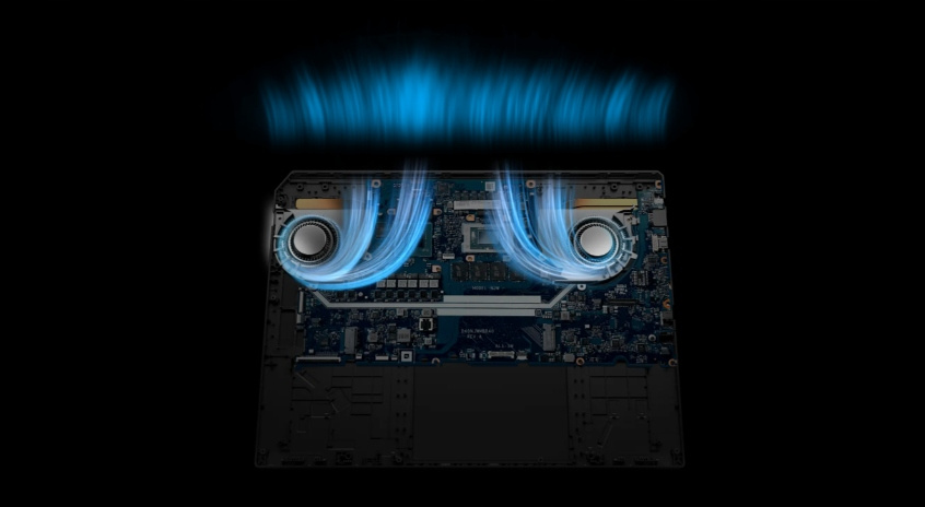 Dodaliśmy niewielkie zagięcia na końcu każdej z 84 głównych łopatek, które zmniejszają zarówno zużycie energii, jak i turbulencje. Wentylatory wyróżniają się teraz konstrukcją z dwoma wirnikami i mniejszym zestawem 42 łopatek wewnątrz. Umożliwia to zasysanie większej ilości powietrza przy każdym obrocie, podobnie jak w przypadku turbiny silnika odrzutowego. Wentylatory te zużywają o 16% mniej energii, zwiększając jednocześnie przepływ powietrza o 11%, dzięki czemu wysokowydajne komponenty wewnętrzne mogą pracować z najwyższą możliwą wydajnością.