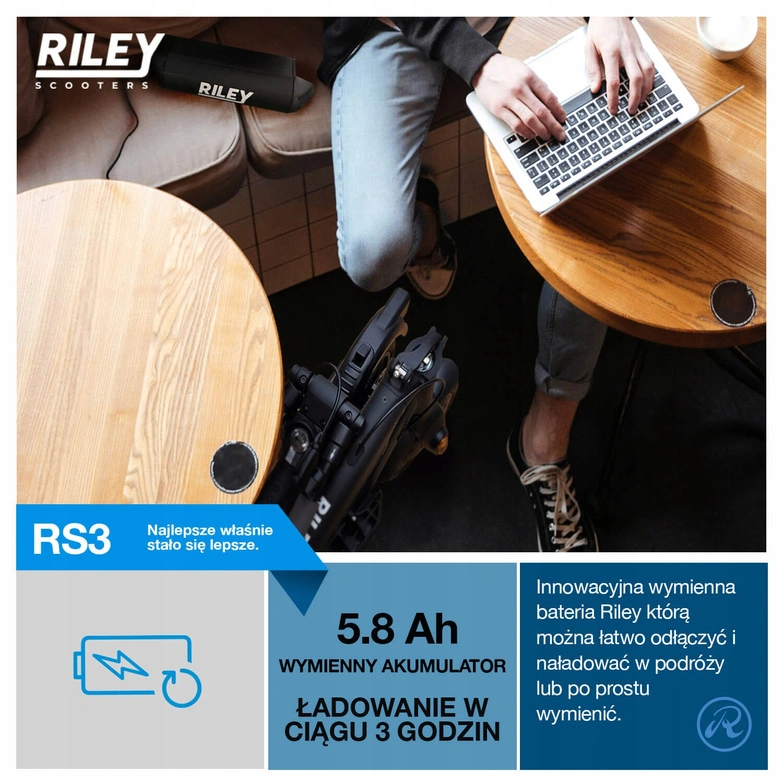 Odkryj nową erę mobilności miejskiej dzięki Riley Scooter RS3, przełomowemu dodatkowi do wysokowydajnej e-mobilności. Zaprojektowany z myślą o bezproblemowych codziennych dojazdach do pracy, RS3 oferuje nie tylko mocny silnik o mocy 350W i odłączany akumulator zapewniający zasięg 25km, ale także przenosi przenośność na wyższy poziom dzięki pełnej możliwości składania.